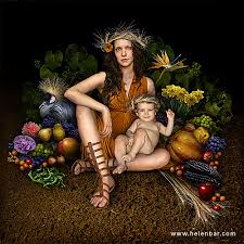 Demeter - É a maior das divindades gregas ligadas à terra produtora; seu nome significa Terra-mãe. De Zeus teve Perséfone, que foi raptada por Hades. Enraivecida, fez com que a terra se tornasse árida. Zeus, para aplacá-la, obteve de Hades que Perséfone permanecesse quatro meses nos Infernos, junto com o marido, e oito meses ao lado de sua mãe. O seu mito em relação a Perséfone teve lugar nos mistérios eleusinos.